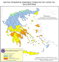 Σύμφωνα με τον χάρτη Πρόβλεψης Κινδύνου Πυρκαγιάς για την Τρίτη 5/7: